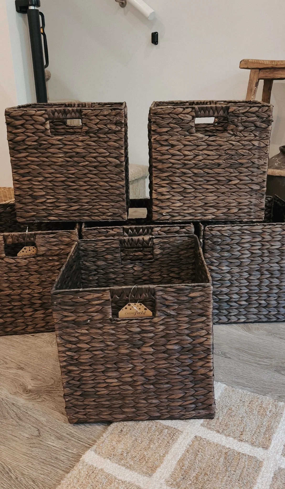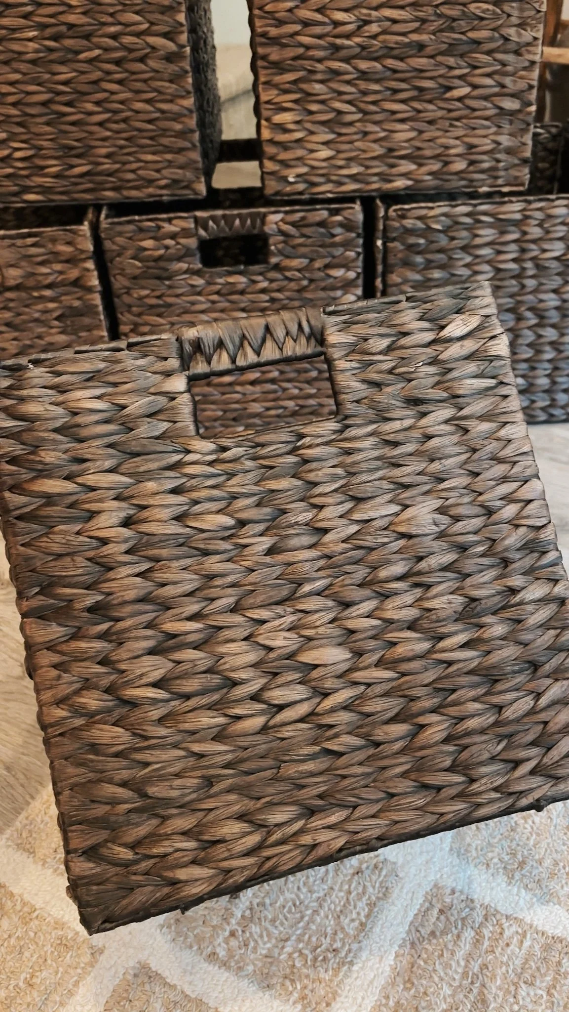Because I'll be seeing them everyday, I wanted more than just a standard plastic storage bin. These decorative storage bins are made from seagrass, offering both durability and an aesthetic touch that complements a wide range of home decor styles. Available in both dark brown and natural finishes, they add a warm, earthy vibe to the space. For a cohesive look, you could even mix and match them throughout your home.